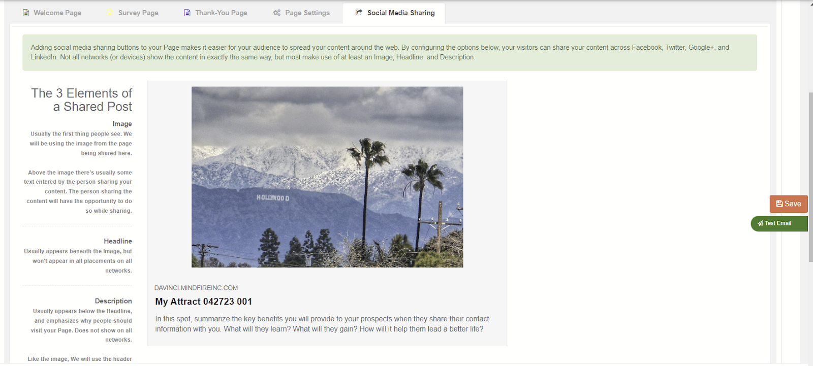 The final item about the landing pages is the setup for posting this page along with any associated content on the company pages on Facebook and LinkedIn using the Social Media Sharing tab. This is also a standard feature in the Capture Leads blueprints and documentation on them is available in our Knowledge base.