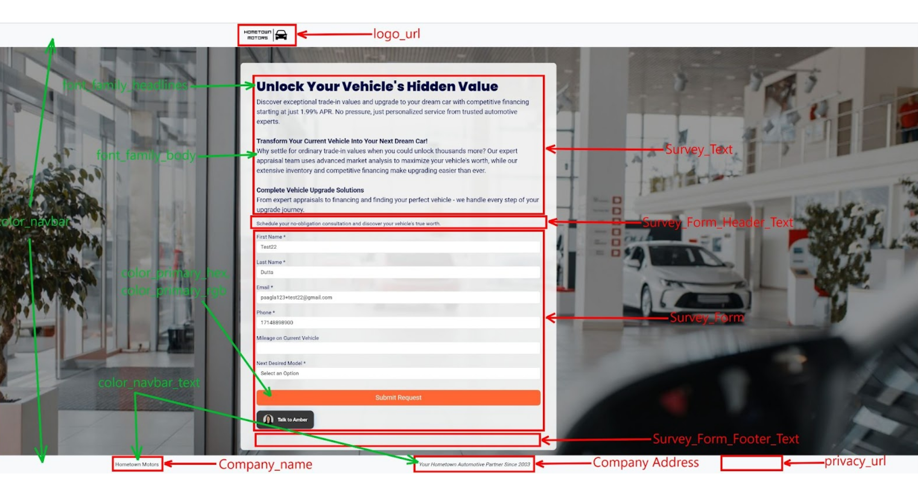 These variables control branding, typography, colors, contact information, and all UI/UX elements of the Survey and Thank You pages.